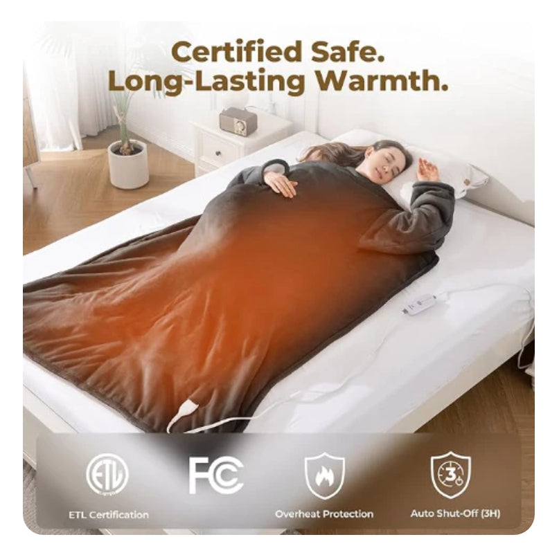 Yes! Our electric blanket is ETL & FCC certified and features a smart overheat protection system with automatic shut-off, instantly cutting power if abnormal temperatures are detected. It also includes a 10-hour auto-off function to prevent potential risks if left on accidentally. Built with reinforced, anti-break wiring tested over 80 times, it provides safe, worry-free comfort for you and your family.